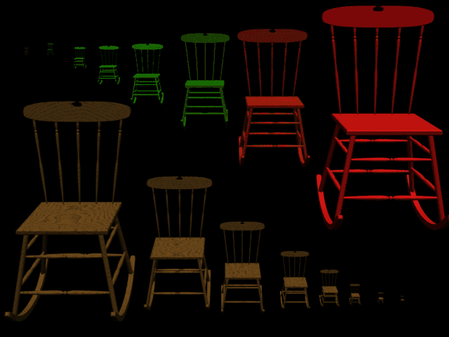 A RIB file was creating specifying appropriate detail levels for each reprentation, and chairs at different distances were rendered. Accross the top, representations were color coded to show how the various representations are smoothly blended. The chairs accross the bottom illustrate a more realistic application. Even when animated, the transitions between these models occur smoothly.