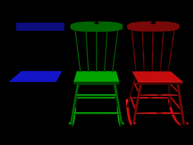 Three different models of a chair were created. The simplest is only two bilinear patches. The second has several patches, and some simple cylinders for the spindles in the back. The most detailed model has nicely sculpted surfaces for all of the spindles.
