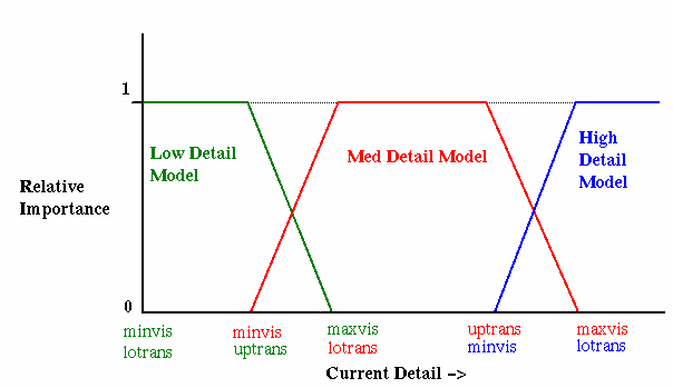 - If the current detail lies between minvisible and lowertransition, or between uppertransition and maxvisible, the model smoothly transitions between subsequent representation, and representations specified for other detail ranges.