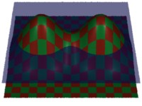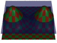 Blobby 3 [ 1001 0 1001 16 1001 32 0 3 0 1 2 ] [ 1 0 0 0 0 1 0 0 0 0 1 0 0 0 0 1 1 0 0 0 0 1 0 0 0 0 1 0 1 0 0 1 1 0 0 0 0 1 0 0 0 0 1 0 2 0 0 1 ] [ "" ] "vertex mpoint Pref" [ 1 0 0 0 0 1 0 0 0 0 1 0 0 0 0 1 1 0 0 0 0 1 0 0 0 0 1 0 1 0 0 1 1 0 0 0 0 1 0 0 0 0 1 0 2 0 0 1 ] "color Cs" [.1 .9 .2] # these are the "color Ct" [.9 .2 .1] # colors of the checksThere are three blobs in a line. The transformations given for Pref are the same as those used to specify the object, so Pref will be the same as the blobby's object space coordinates. As you might expect, the solid-texture checkerboard mapped onto the surface is undistorted.