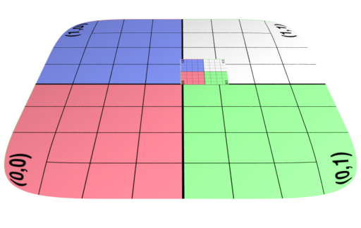 The indices of the vertices of the child faces are labeled green, and this is where the difference lies between the extraordinary and regular case; in the extraordinary case, vertex to vertex subdivision always results in a vertex labeled 0, while in the regular case, vertex to vertex subdivision assigns the same index to the child vertex. Again, specifically, we note that the parent vertex indexed 1 in the extraordinary case has a child vertex 0, while in the regular case the parent vertex indexed 1 actually has a child vertex that is indexed 1. Note that this indexing scheme was chosen to maintain the property that the vertex labeled 0 always has the lowest u/v parametric value on the face.